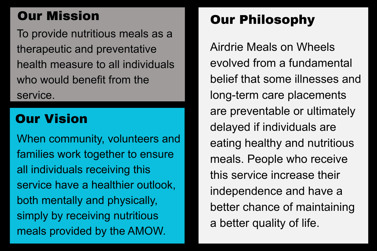 Airdrie Meals on Wheels is a non-profit society that has been committed since 1983 to providing individuals with nutritious, affordable meals, delivered to their door, 5 days a week, with extra meals available for the weekends. Individuals are always welcome, regardless of their income, or whether they require short-term or long-term assistance.